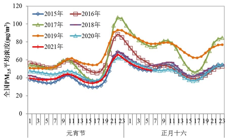 圖4 2015年至2021年元宵節(jié)至正月十六北京市逐小時PM2.5濃度