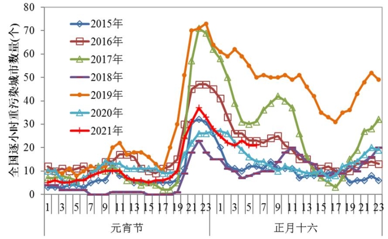 從近七年元宵節(jié)期間全國城市環(huán)境空氣質(zhì)量變化情況來看,受不利氣象條件和煙花爆竹燃放影響,2021年元宵節(jié)期間全國339個城市PM2.5最大小時平均濃度較去年元宵節(jié)最大值上升了6.5%,較近三年(2018-2020年)最大值的平均值下降了11.6%。峰值污染期間全國重污染城市數(shù)量較去年增加了10個,較近三年平均重污染城市數(shù)量減少了4個。
